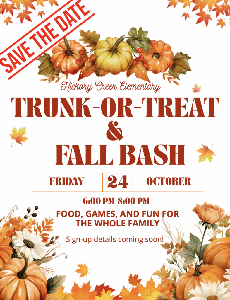 Oct. 24 – PTO Sponsored Fall Festival/Trunk or Treat 6PM